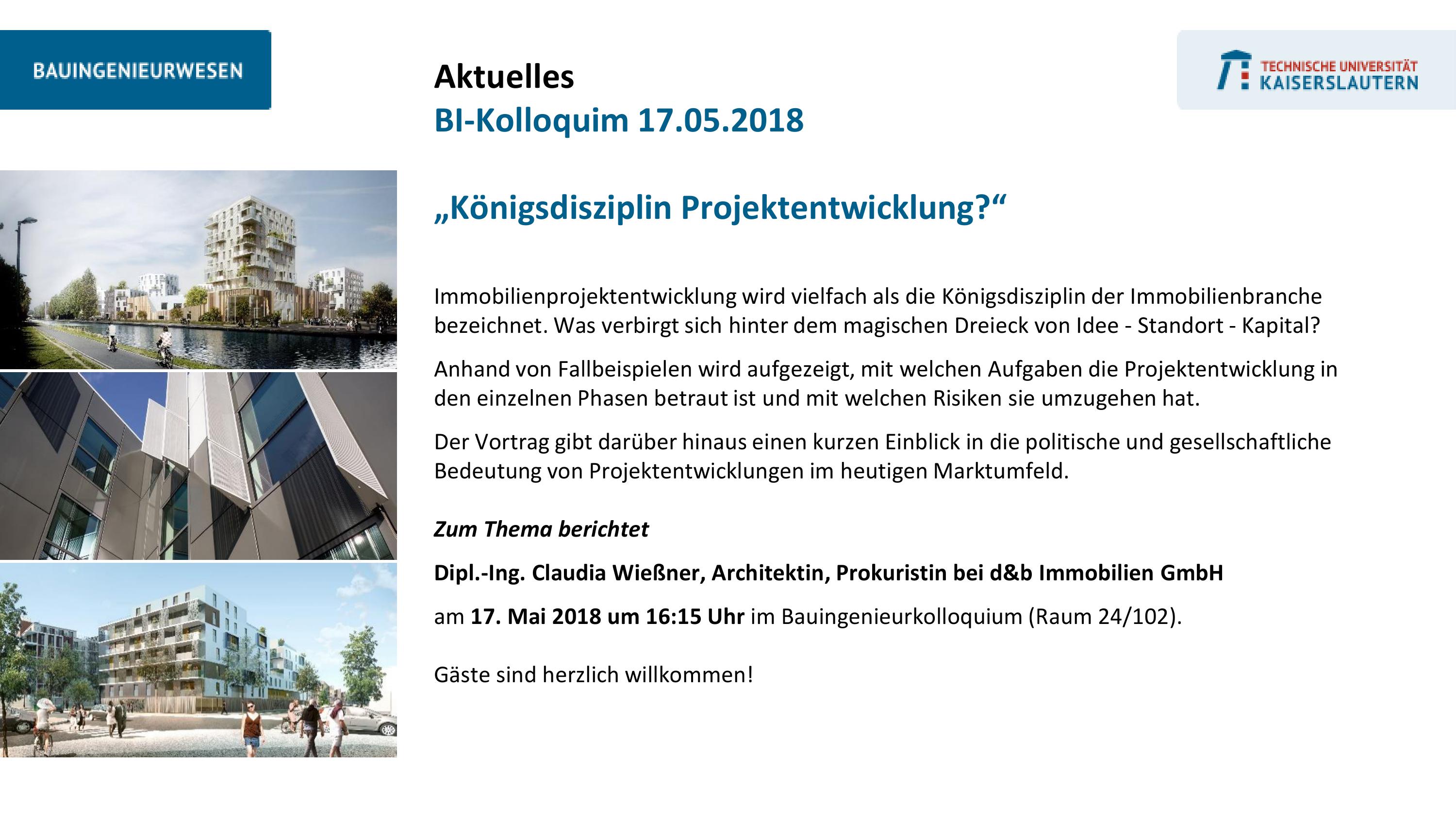 Claudia Wießner, Prokuristin und Architektin der d&b Immobilien, wird am 17.5.2018 auf dem Bauingenieur-Kolloquium der Technischen Universität Kaiserslautern vor interessierten Studenten einen Vortrag halten über die Aufgaben und Herausforderungen der Projektentwicklung unter dem Titel: Königsdisziplin Projektentwicklung?